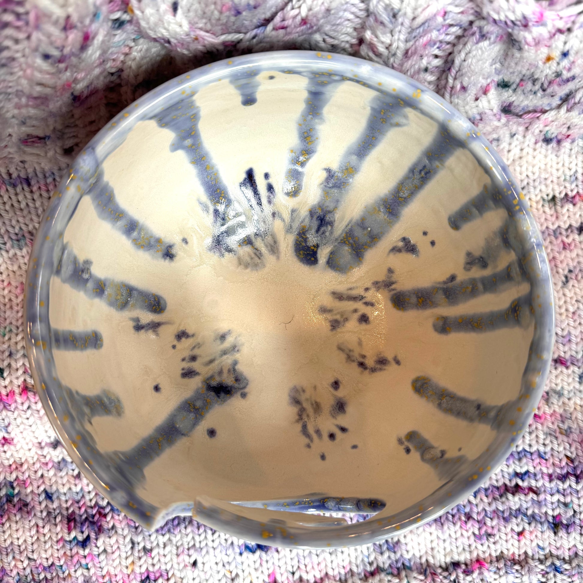 This yarn bowl was hand thrown on a pottery wheel, and hand carved. It is glazed with purple speckles on the outside, and a mix of colors inside. It is pictured with one full skein of worsted weight wool that has been single wound.